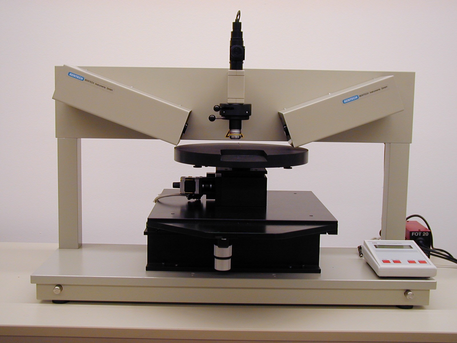 SE 400-300, SE 500-300, SE 800-3The SE X00-300 is a large area ellipsometer with fixed angle of incidence and outstanding features such as very high repeatability of layer thickness and refractive index, auto focus (optional), large number of predefined applications, and material library which makes the instrument suitable for small scale productions. The ellipsometer platform allows the extension of the metrology tool for even larger substrates. The ellipsometer can be a discrete wavelength ellipsometer SE 400-300 or a spectroscopic ellipsometer SE 800-300. The SE 500-300 comprises the SE 400-300 and the Film Thickness Probe FTPadvanced installed together with the auto collimating telescope |